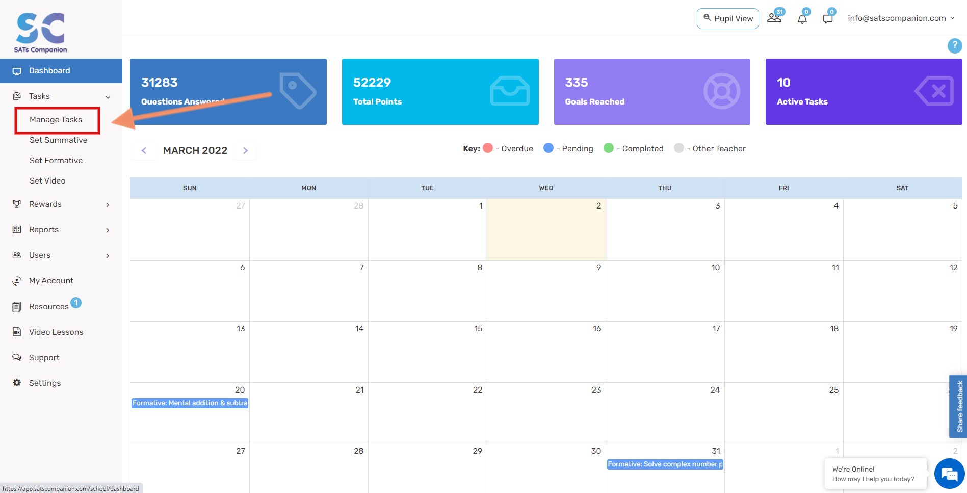 Step 1: From the SATs companion dashboard, open the sidebar on the left-hand side of the screen. Open the ‘tasks’ menu and select ‘manage tasks’.